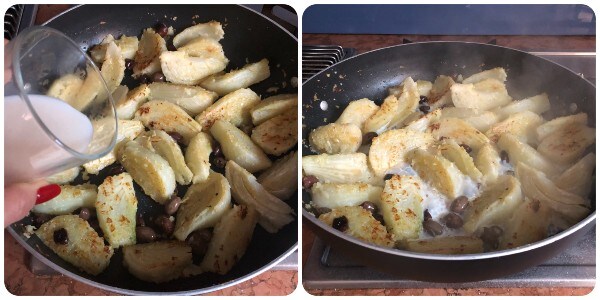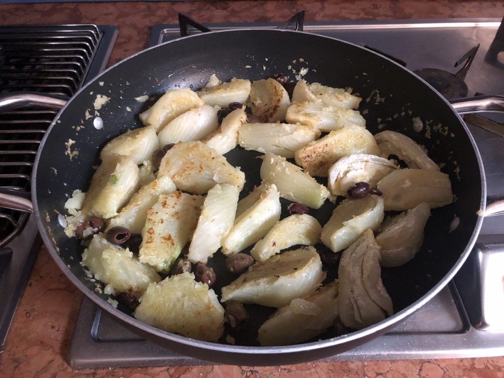 Quando a manteiga derreter, coloque na caçarola o funcho empanado e as azeitonas taggiasche e tempere com uma generosa pitada de sal.
