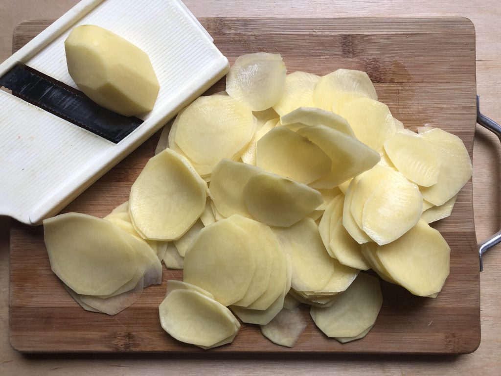 • Descasque as batatas, lave, seque-as com papel toalha e corte em fatias finas com a mandolina.