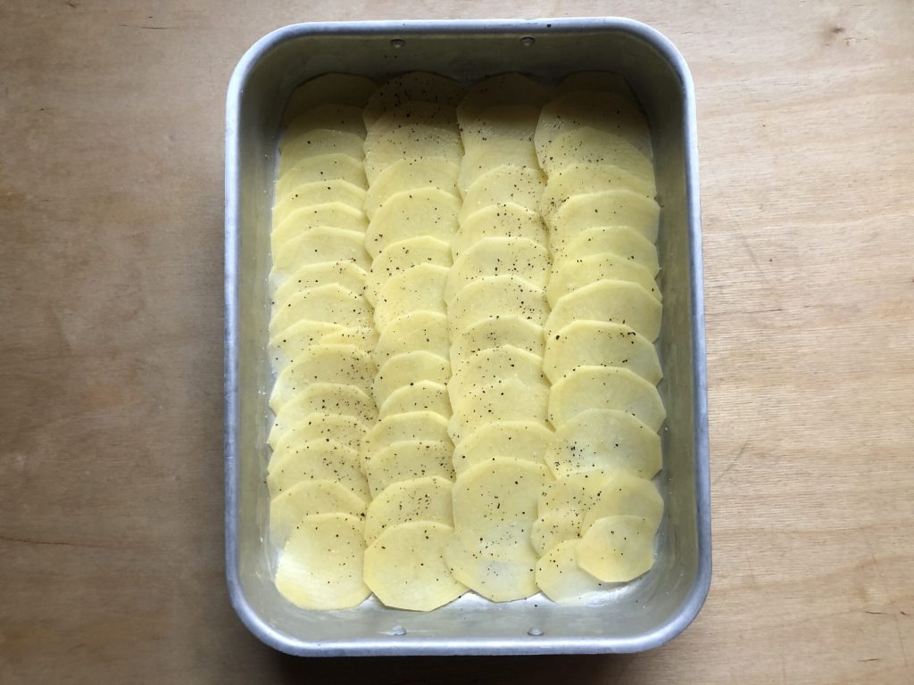 • Unte com um pouco de manteiga uma assadeira de forno e disponha no fundo uma primeira camada de batatas, sobrepondo-as ligeiramente. Então, salpique sal e pimenta a gosto.