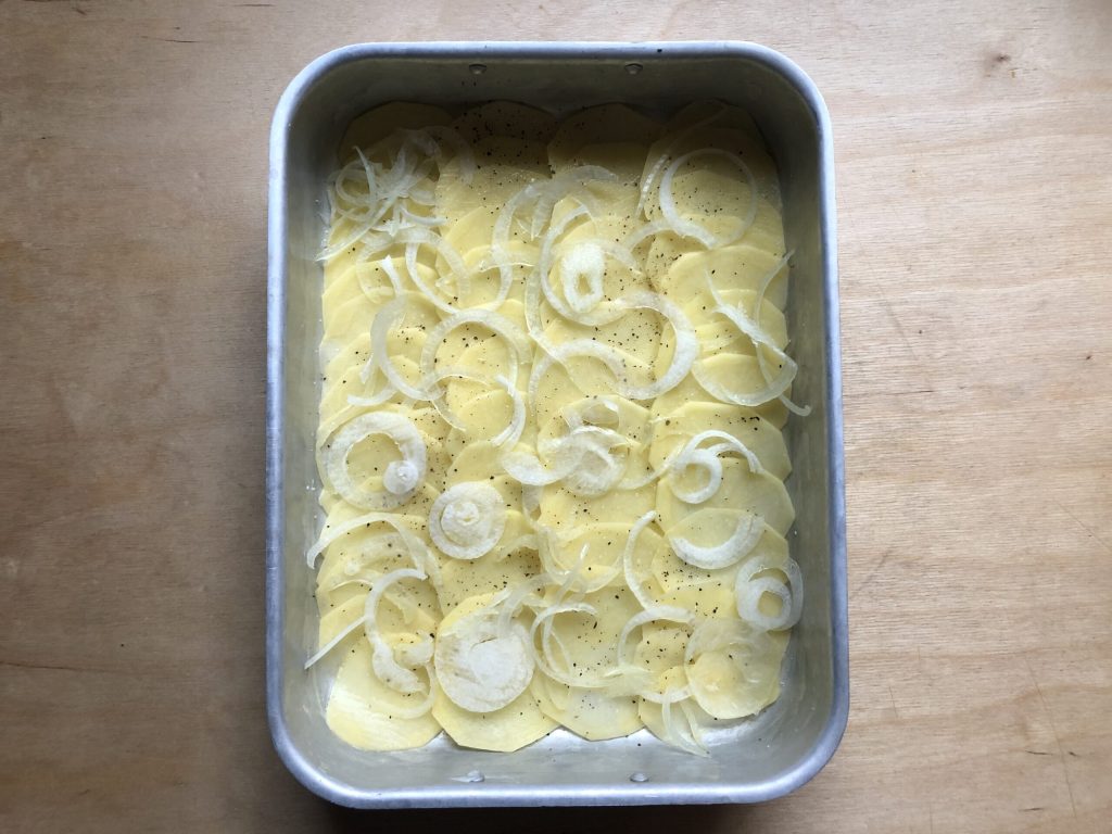 Ingredientes para o gratin de batatas e cebolas ao leite