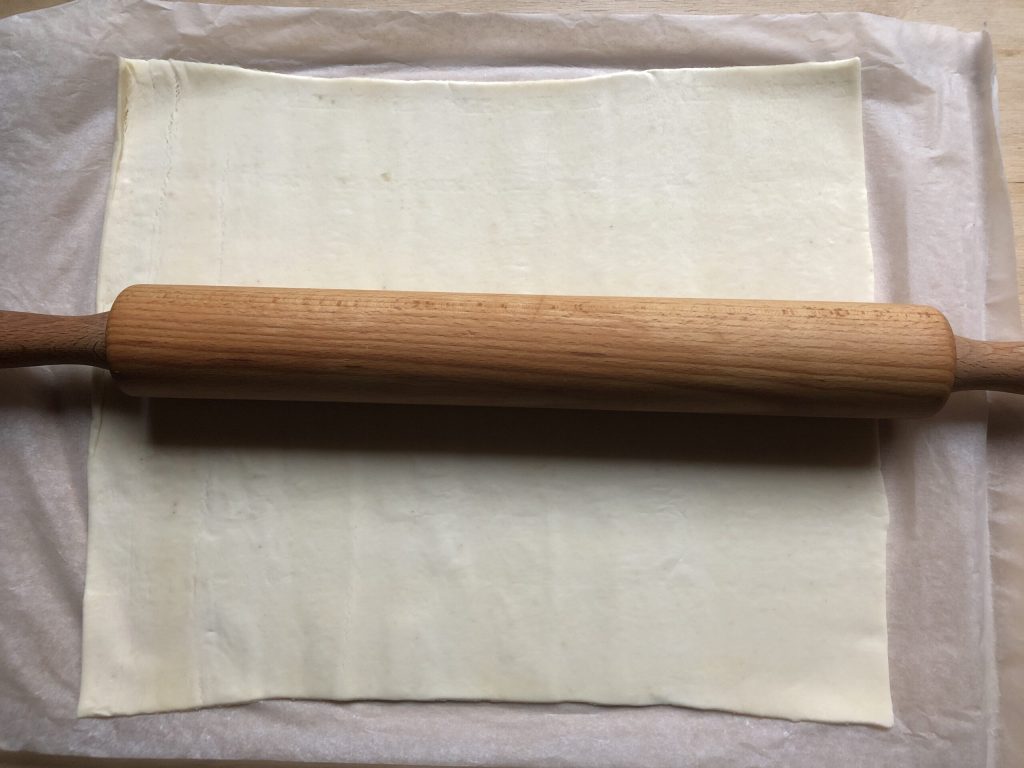 Desenrole o retângulo de massa folhada, mantendo-o sobre o papel manteiga fornecido na embalagem. Em seguida, passe delicadamente o rolo de massa por cima para torná-lo mais homogêneo.