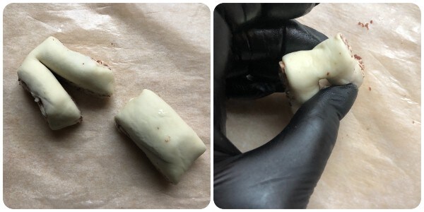 Pegue cada pedaço e faça um corte sem tocar na extremidade inteira da massa: você notará, de fato, que cada pedaço tem uma parte inteira e uma parte dupla. O corte deve ser feito mantendo intacta a parte inteira.