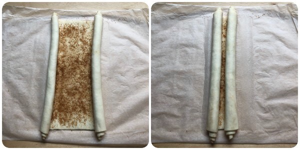 • Neste ponto, enrolar o retângulo a partir de ambos os lados curtos até unir os dois rolos obtidos no centro.