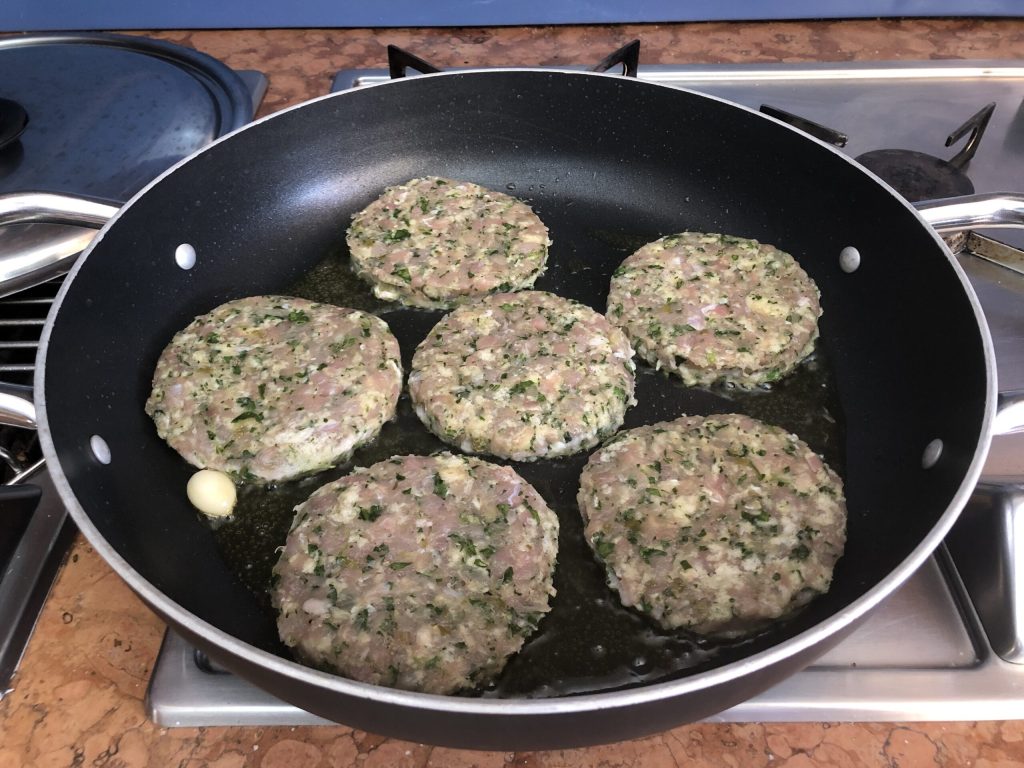 Em uma panela grande, aqueça algumas colheres de sopa de óleo e frite um dente de alho descascado e inteiro antes de adicionar os hambúrgueres.