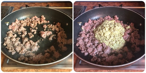 Enquanto os alhos-poró cozinham, descascar as duas linguiças e desmanchá-las com um garfo. Reservar.