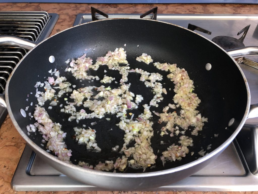 Em uma caçarola grande, aqueça algumas colheres de azeite antes de adicionar o picado de echalote e alho. Adicione também flocos de pimenta vermelha na quantidade desejada conforme seu gosto pessoal.