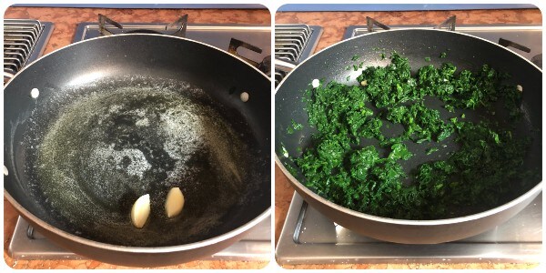 Elimine da frigideira a água que restou do cozimento dos espinafres, adicione a manteiga e um dente de alho descascado, cortado ao meio e sem o miolo central (se preferir, pode picá-lo finamente). Deixe fritar por alguns instantes, depois junte os espinafres e deixe-os pegar sabor em fogo alto por alguns minutos, mexendo sempre.