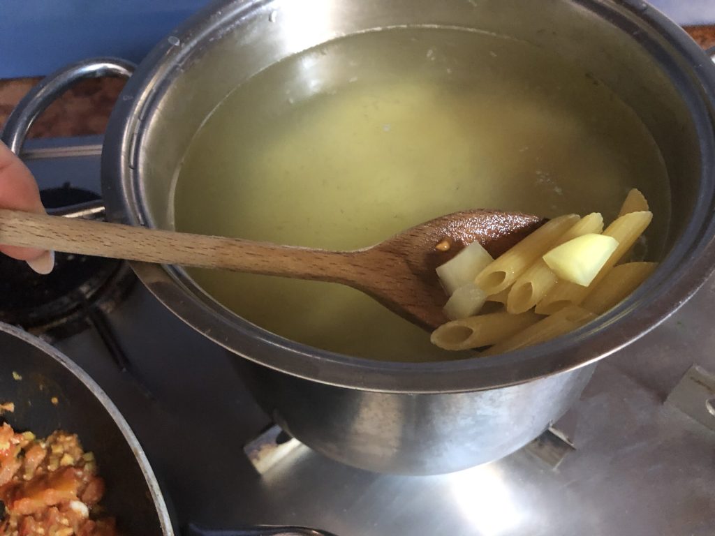 Preparo do macarrão com tomate e batatas