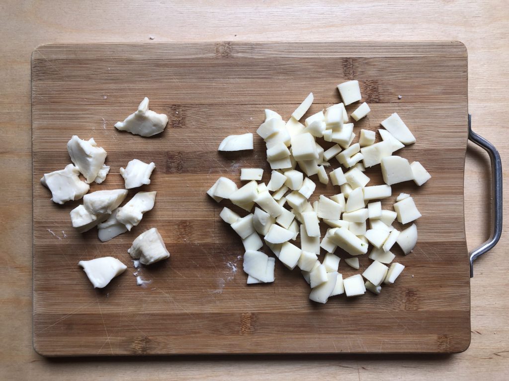 • Corte em pedaços tanto a scamorza quanto o taleggio.