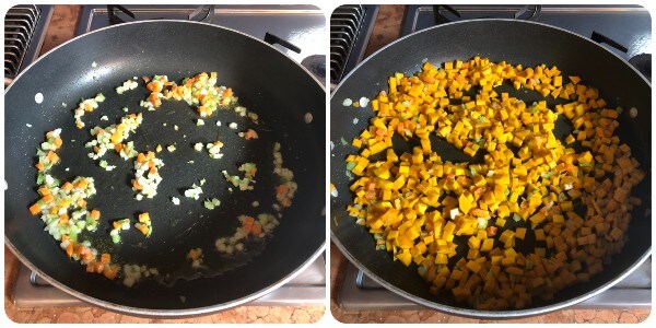 Numa caçarola grande, aqueça algumas colheres de óleo antes de adicionar a mistura para refogado. Deixe refogar por alguns instantes, depois adicione os cubos de abóbora e doure-os em fogo alto por alguns minutos.
