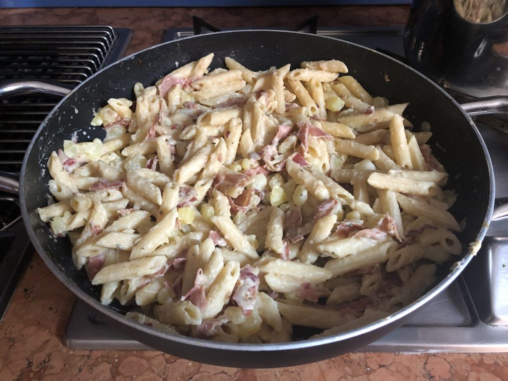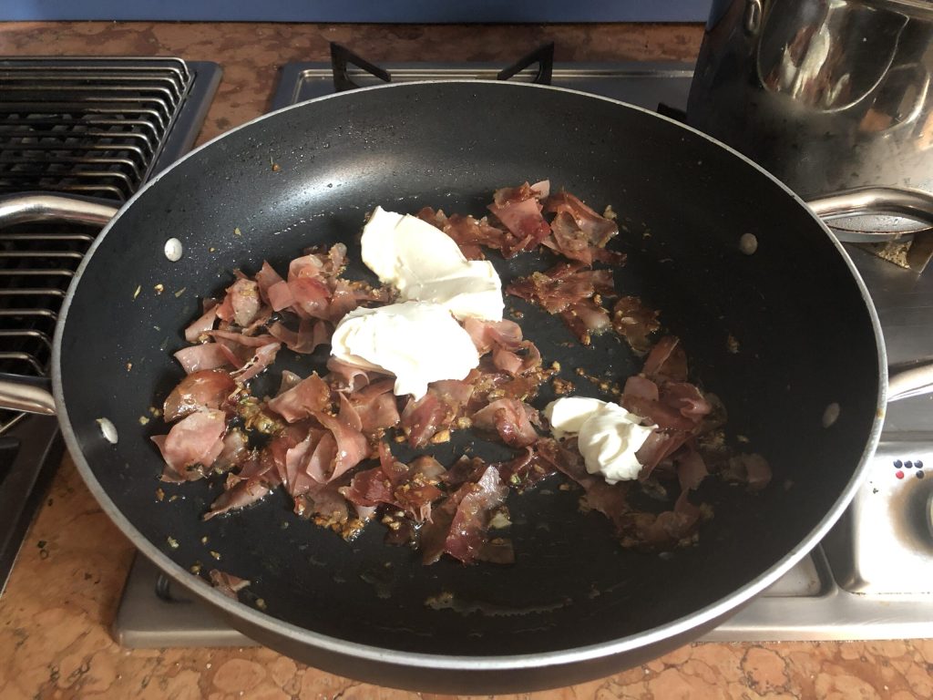 Neste ponto, adicione a robiola e dilua o molho com um pouco de água de cozimento da massa. Esqueci de tirar uma foto.