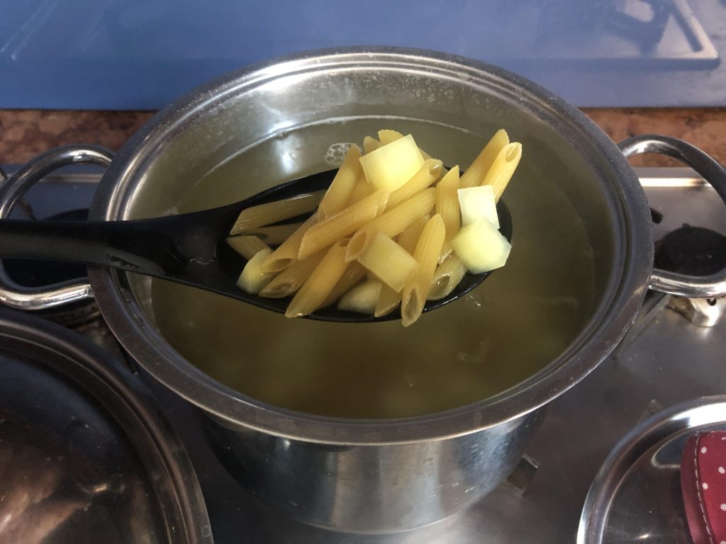 Em uma panela grande, ferva bastante água salgada e cozinhe a massa junto com os cubos de batata (devem ser colocados ao mesmo tempo na água fervente).