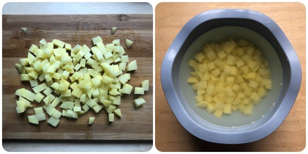 Descasque as batatas, lave-as, corte-as em pedaços e coloque-os em uma tigela cheia de água fria.