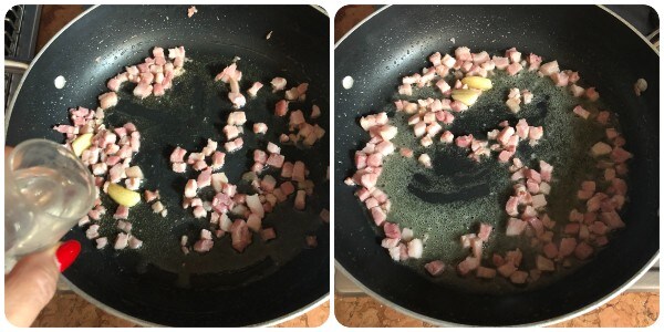 Em seguida, adicione os cubinhos de bacon defumado e doure-os por alguns minutos, mexendo sempre.