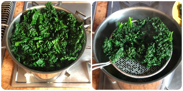 Em uma panela, leve bastante água salgada a ferver e branqueie as folhas de couve-negra por 5 minutos. Em seguida, escorra-as com uma escumadeira, reservando a água que usaremos para cozinhar a massa. Reserve-as.