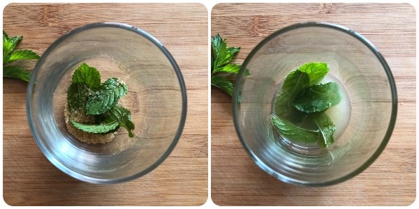 Lave as folhas de menta e coloque-as em um copo. Adicione uma colher de chá de açúcar mascavo e o suco de meio limão (30 ml) e deixe macerar por cerca de meia hora.