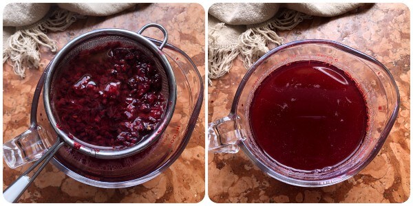 Neste ponto, coe tudo através de uma peneira de malha fina. Recomendo esmagar bem as amoras com um pilão ou uma colher para extrair todo o líquido.