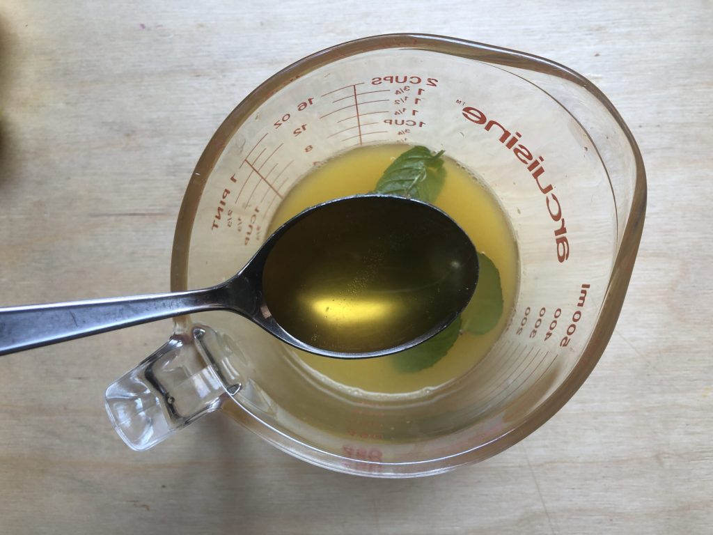 • Adicionar algumas folhas de hortelã e uma colher de mel (eu usei o de mil flores) e mexer cuidadosamente.