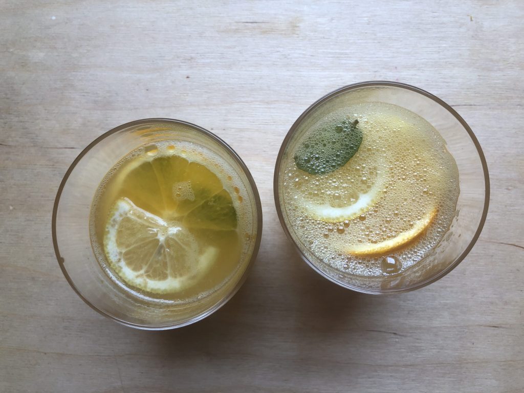 • Dividir esse “suco misto” em dois copos largos e baixos onde você já colocou uma fatia de laranja e meia fatia de limão.