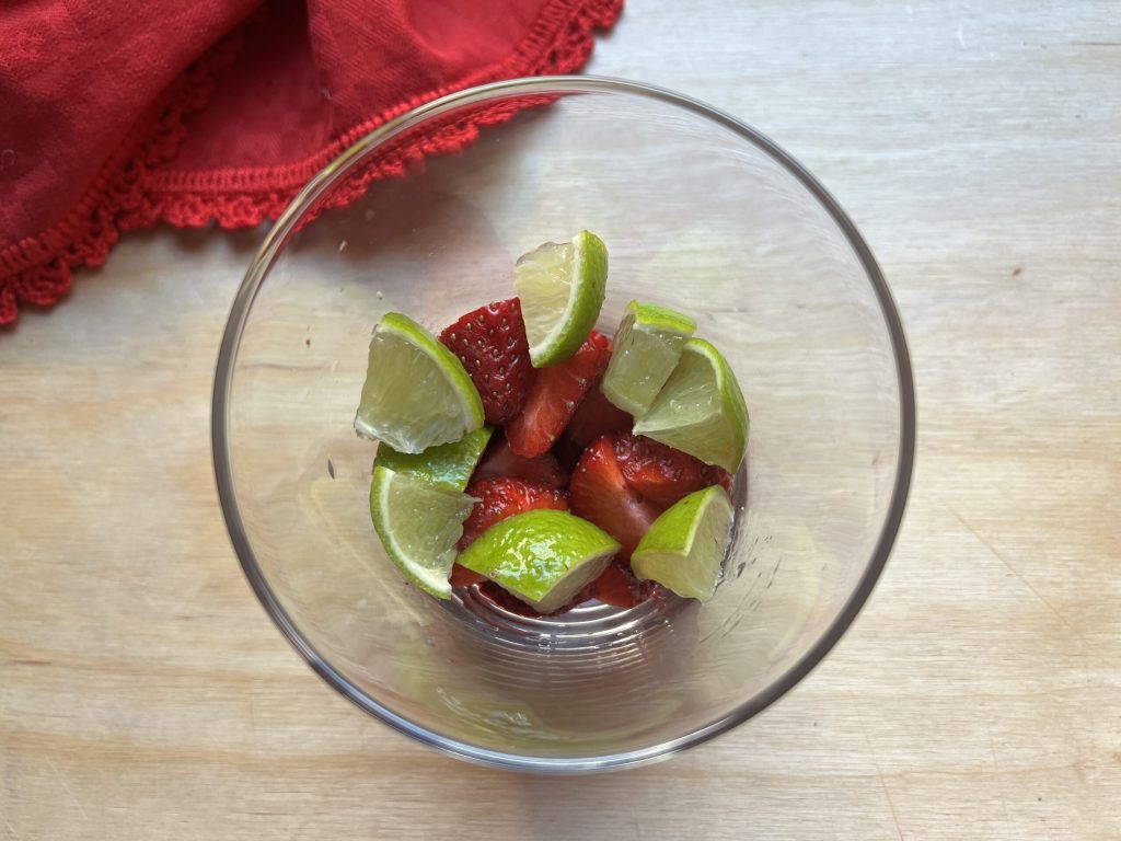 Lave os morangos, corte-os em pedaços e coloque em um copo alto junto com ½ limão cortado em gomos.