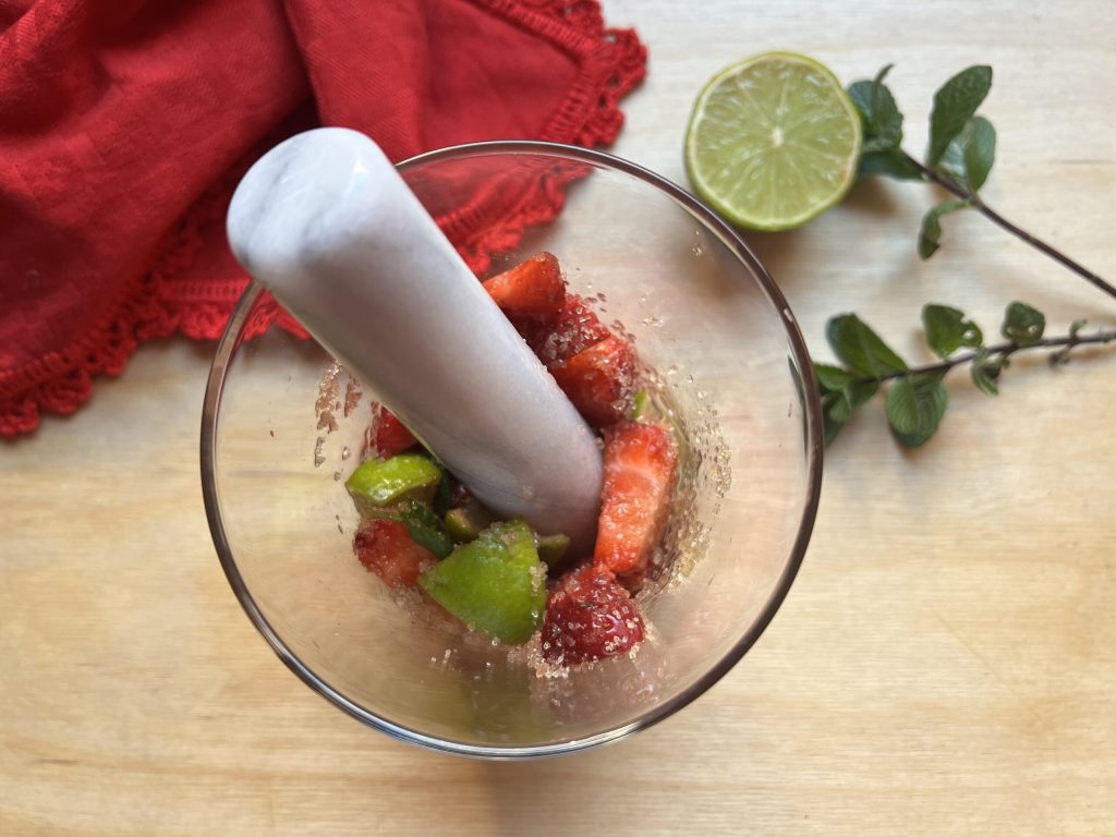 Com um pilão (ou com as costas de uma colher) macere delicadamente tudo: assim as folhas de hortelã liberarão seus óleos essenciais.