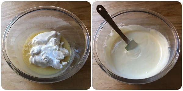 Quando o creme de chocolate branco esfriar, adicione o creme de leite batido e incorpore delicadamente com uma espátula, mexendo de baixo para cima para não desmontar a mistura.
