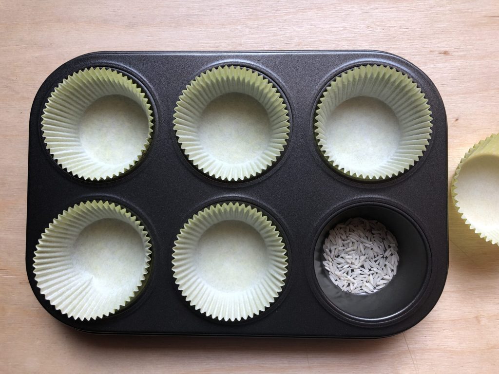 Coloque um pouco de arroz no fundo das cavidades da forma de muffins antes de inserir as forminhas de papel: esse truque nos permitirá obter forminhas limpas no final da cocção.
