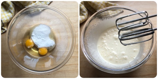 Quebre os ovos em uma segunda tigela, junte o açúcar e bata com as batedeiras elétricas até obter um preparado claro e espumoso.