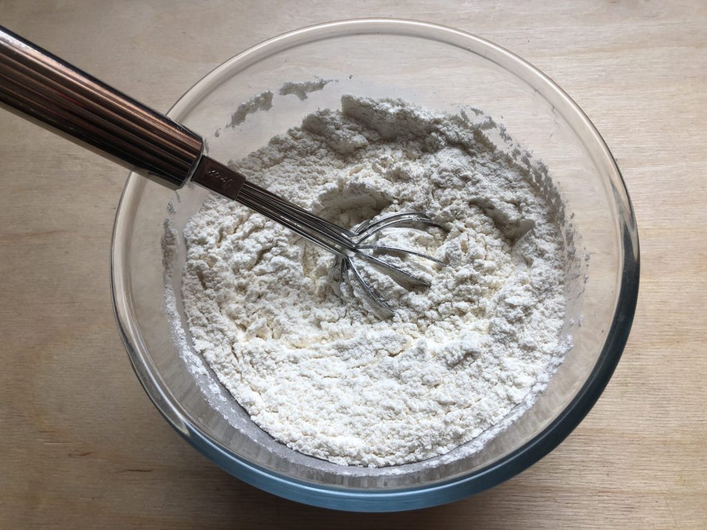 Em uma tigela média, misture a farinha com o fermento e a vanilina.