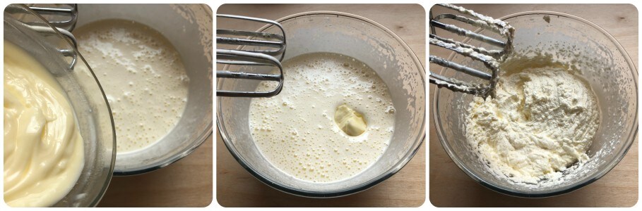 Então, adicione a manteiga já fria e misture novamente com o batedor.