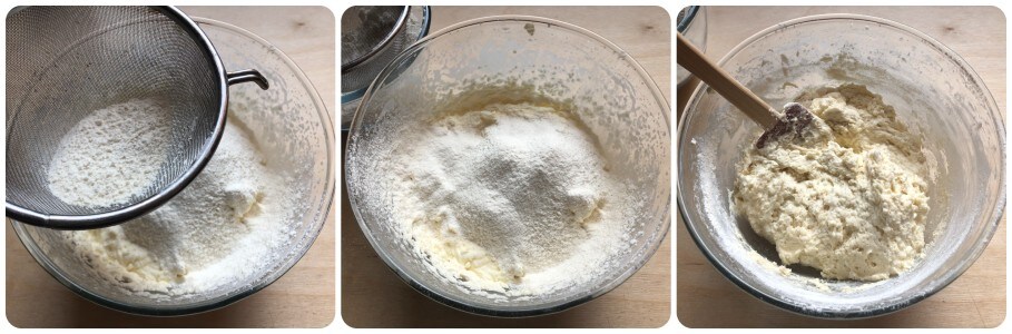 Neste ponto, comece a adicionar gradualmente os ingredientes secos, incorporando-os com uma espátula. Adicione também uma pitada de sal.