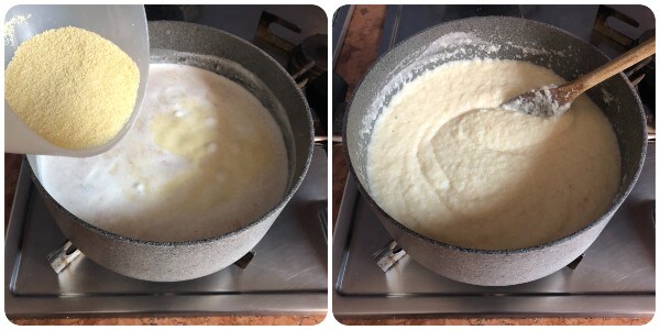 Assim que começar a ferver, comece a adicionar a sêmola em chuva, mexendo continuamente com uma colher de pau para evitar a formação de grumos.