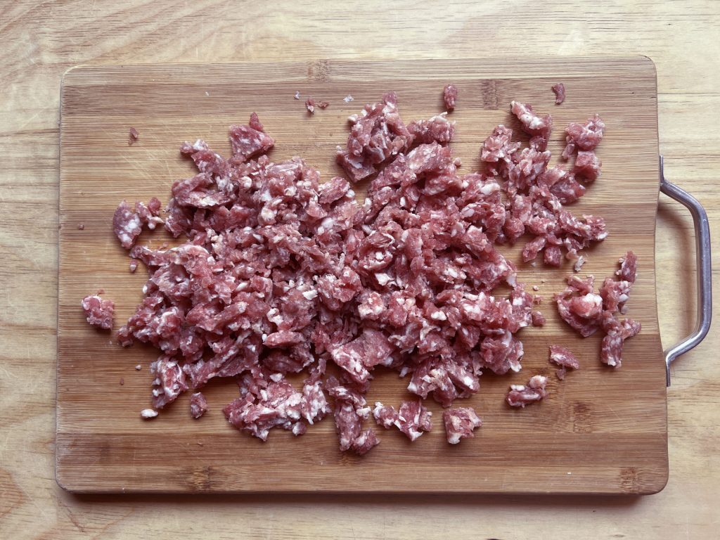 Retire a pele das linguiças e desfaça com um garfo.