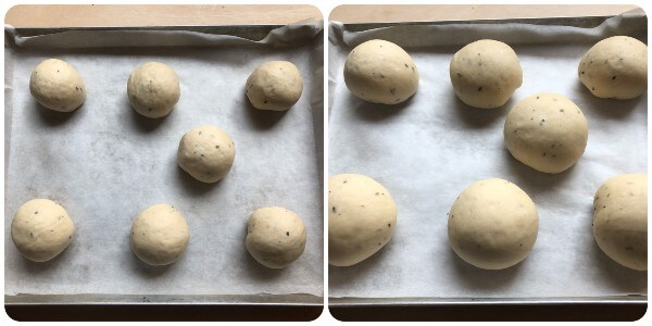 Coloque-as dentro de uma assadeira forrada com papel manteiga, cubra com um pano e deixe crescer por mais uma hora.