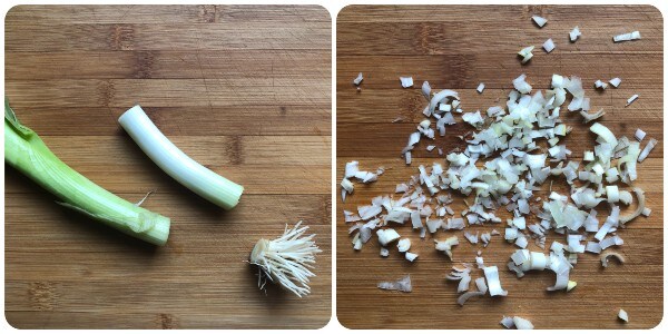 Limpe a cebolinha removendo as raízes e a parte verde e pique finamente a parte branca. Não jogue fora a parte verde, que será usada no final da receita.