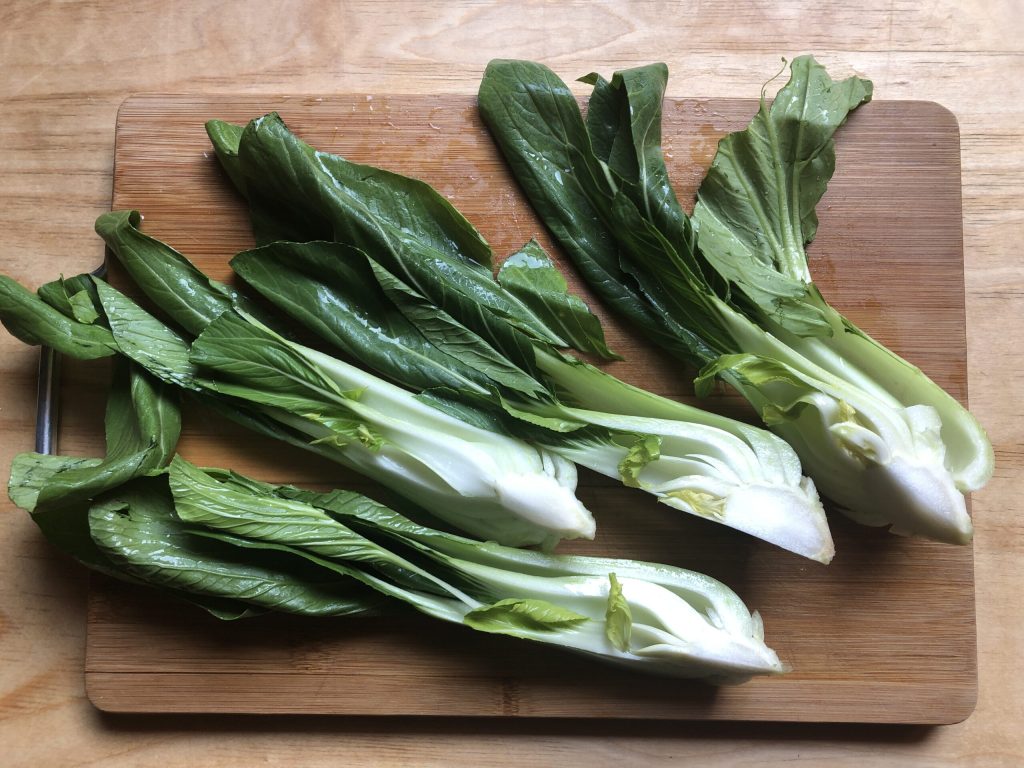 • Lave bem os pak choi em água corrente, escorra, seque com papel-toalha e corte em quartos.