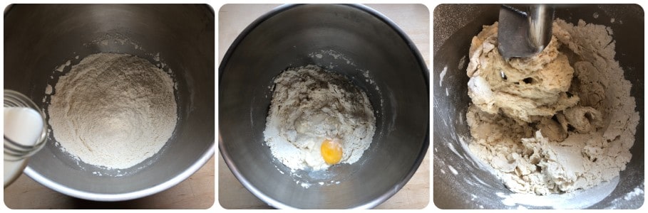 Depois, adicione o leite e o ovo e comece a amassar com o batedor gancho.