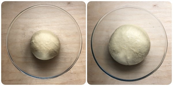 Transfira para a bancada, trabalhe por alguns momentos com as mãos e modele uma bola. Depois, coloque-a dentro de uma tigela grande, cubra com filme plástico e deixe crescer até dobrar de volume em um local morno e protegido de correntes de ar. O tempo de fermentação, como sempre, depende da temperatura ambiente e pode variar de duas a três horas.