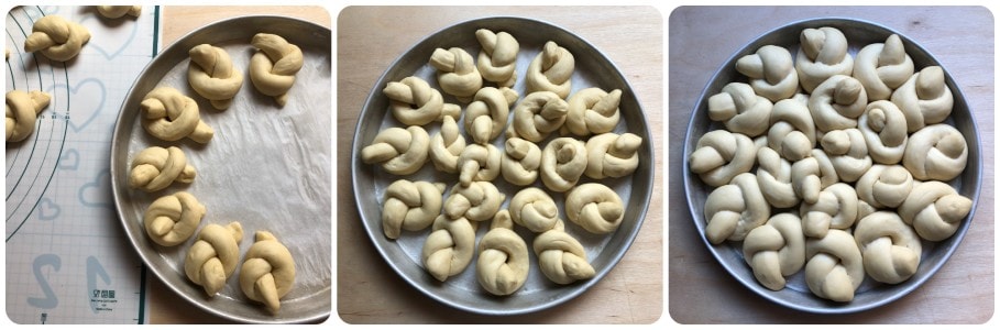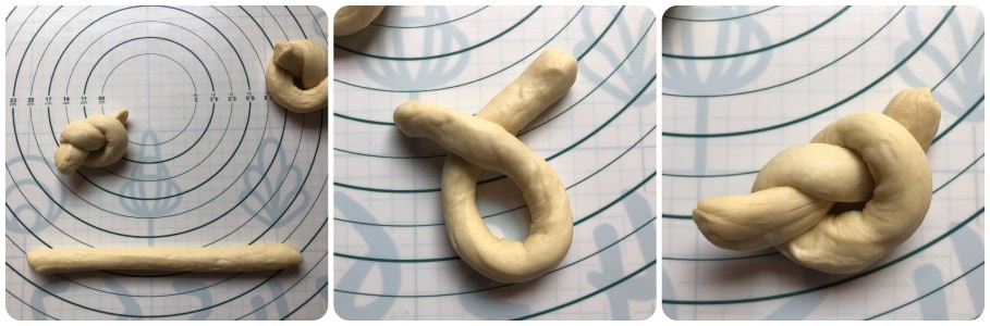 Forme com cada pedaço um filão rolando-o na bancada e dobre-o em forma de nó.