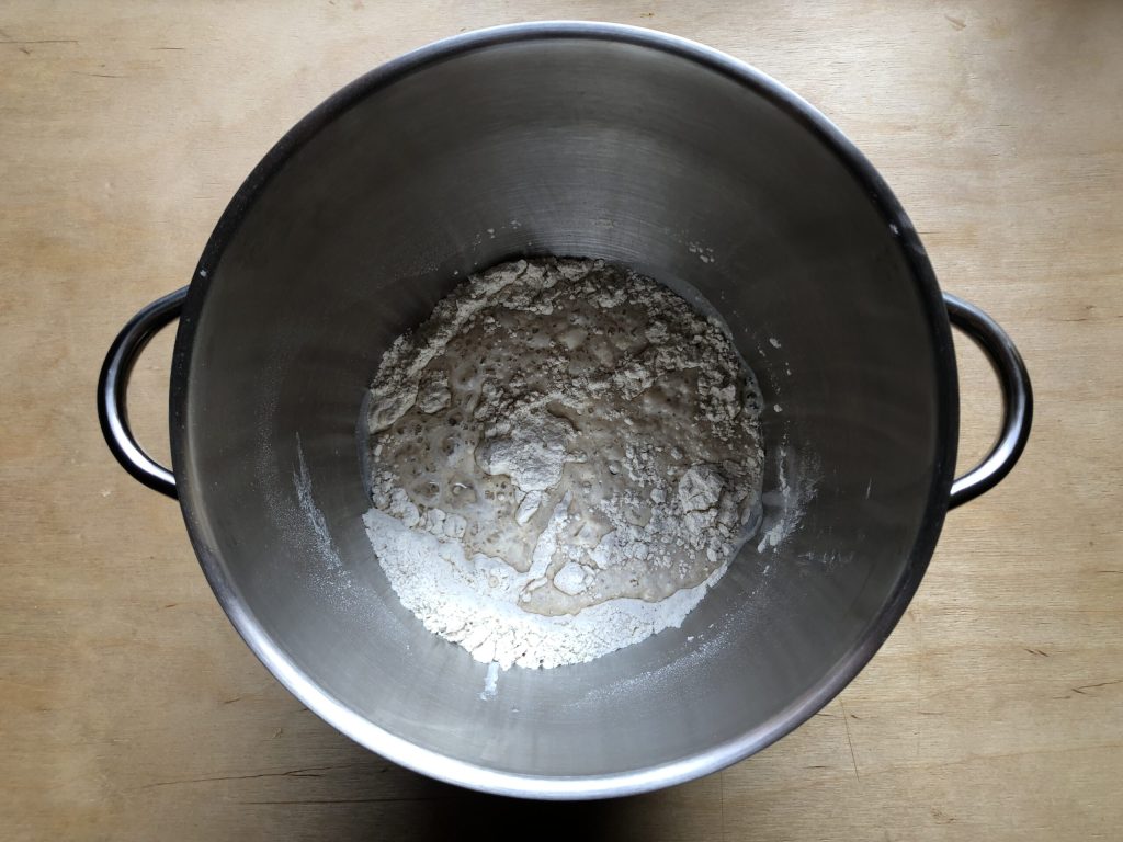 • Adicione o leite e comece a amassar com o batedor de gancho, adicionando gradualmente um pouco de água, se necessário. Deve-se obter uma mistura bem homogênea.