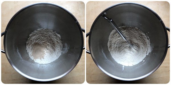 • Em seguida, adicione o malte e o fermento biológico seco e misture com um pequeno batedor de arame.