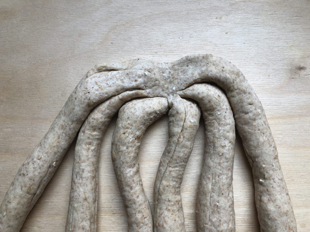 Neste ponto, una as extremidades superiores dos 6 pãezinhos como mostrado na foto.