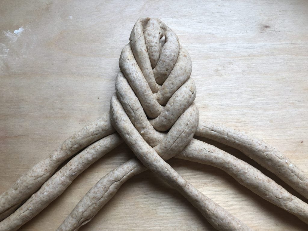 Agora, pegue os dois pãezinhos mais externos e cruze-os para dentro, mantendo sempre abertos os seis rolinhos. Proceda da mesma maneira até o final. Garanto que é mais fácil fazer do que explicar. Basicamente, você sempre cruza os dois pãezinhos mais externos.