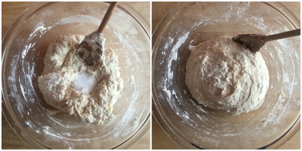 Por último, adicione o sal e misture bem ao restante da massa, que ficará muito mole e pegajosa. NÃO ENTRE EM PÂNICO!!!! É assim mesmo!