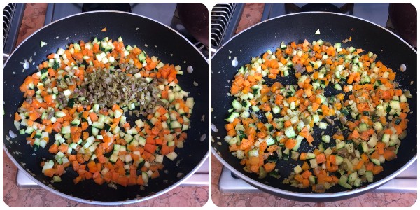 Cozinhe por 5 minutos em fogo médio, mexendo de vez em quando. Depois, adicione as azeitonas verdes, uma generosa pitada de sal e bastante pimenta preta moída e continue cozinhando por mais 4/5 minutos. O tempo de cozimento, na verdade, depende muito do tamanho dos seus vegetais. Portanto, use seu bom senso. Ao final da cocção, as abobrinhas e as cenouras devem estar macias, mas ainda crocantes. Não devem se desmanchar.