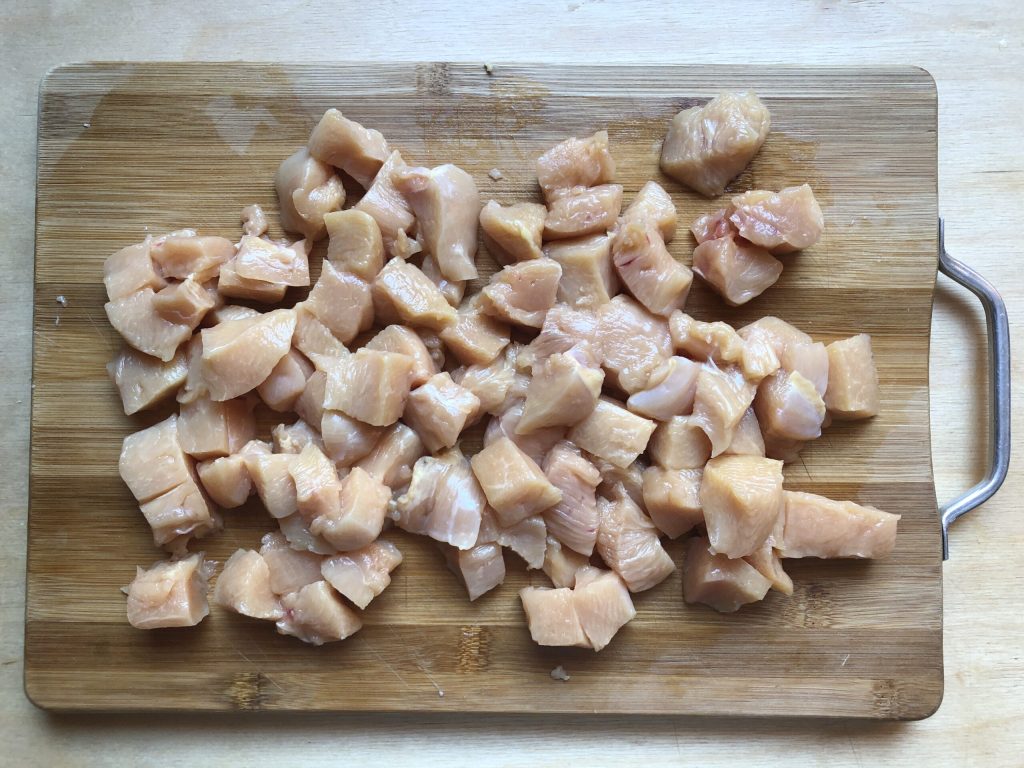 • Limpe o peito de frango removendo as cartilagens, o osso central e quaisquer partes gordurosas, em seguida, corte-o em pedaços.