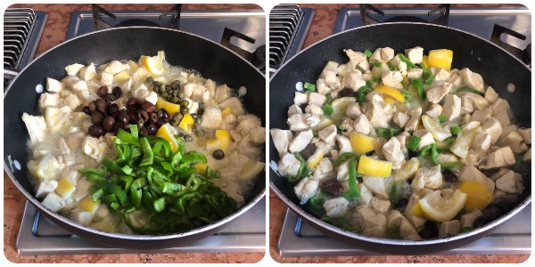 • Em uma panela grande, aqueça algumas colheres de azeite antes de adicionar os pedaços de frango e os pedaços de limão. Doure em fogo alto por 5 minutos, mexendo frequentemente, depois adicione o vinho branco e deixe evaporar.