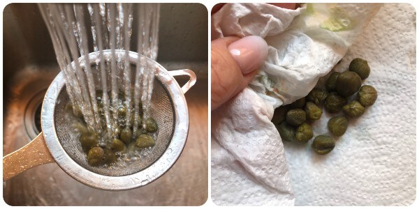 Dessalgar as alcaparras em água corrente, secá-las com papel toalha e reservá-las. Se preferir usar alcaparras em conserva, enxágue-as mesmo assim.