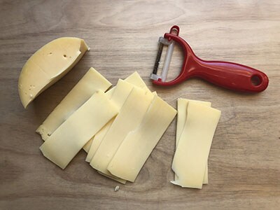 Corte o queijo em fatias finas: eu usei um descascador de batatas, mas uma fatiadora também funciona bem.