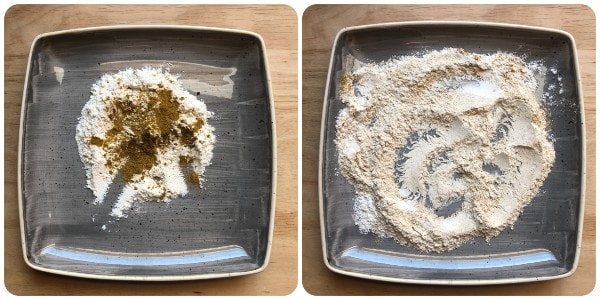 Em um prato, misture a farinha com o curry (você pode dosar essa especiaria conforme seu gosto pessoal).
